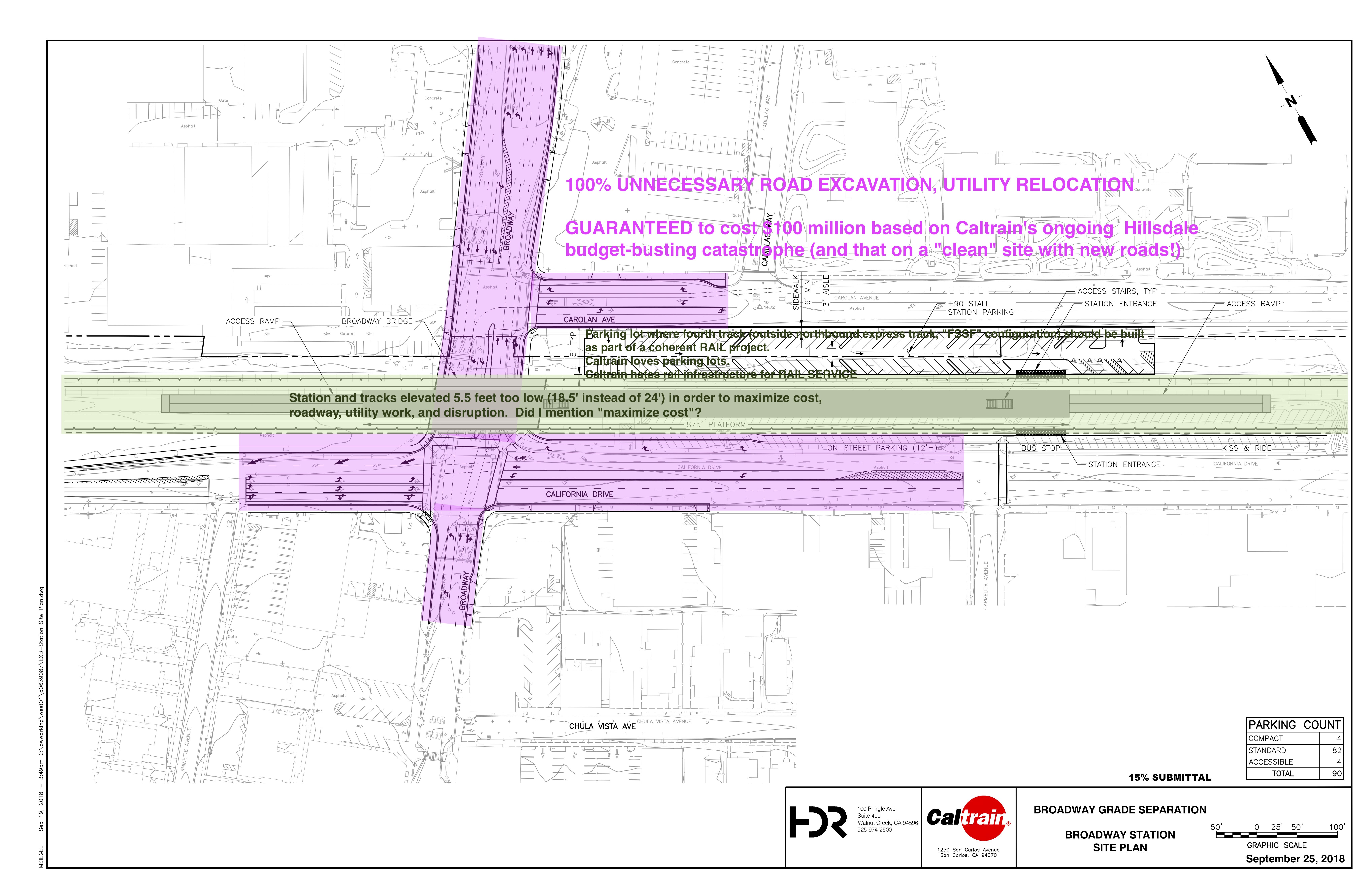 It's a perfectly logically crafted story: CP Trousdale to the north "constrains" the length of the grade separation structure, which combined with 60 mph freight speed and 1% grade design rules "prevent" the structure from being sufficiently elevated over Broadway, which in turn "requires" ...It's also a story that is laughably, insultingly fraudulent. No question about it: Caltrain's staff and Caltrain's perma-temp consultant mafia are simply outright lying. Their sole priorities are cost maximization and self-enrichment.